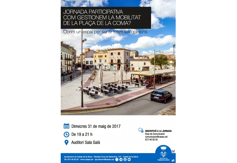 L'Ajuntament de Cassà de la Selva ha organitzat per demà a les 19h a la Sala Galà una jornada participativa sobre com s'ha de gestionar la mobilitat de la plaça de la Coma. A l'acte, que és obert a tota la ciutadania, es recolliran les opinions dels assistents.