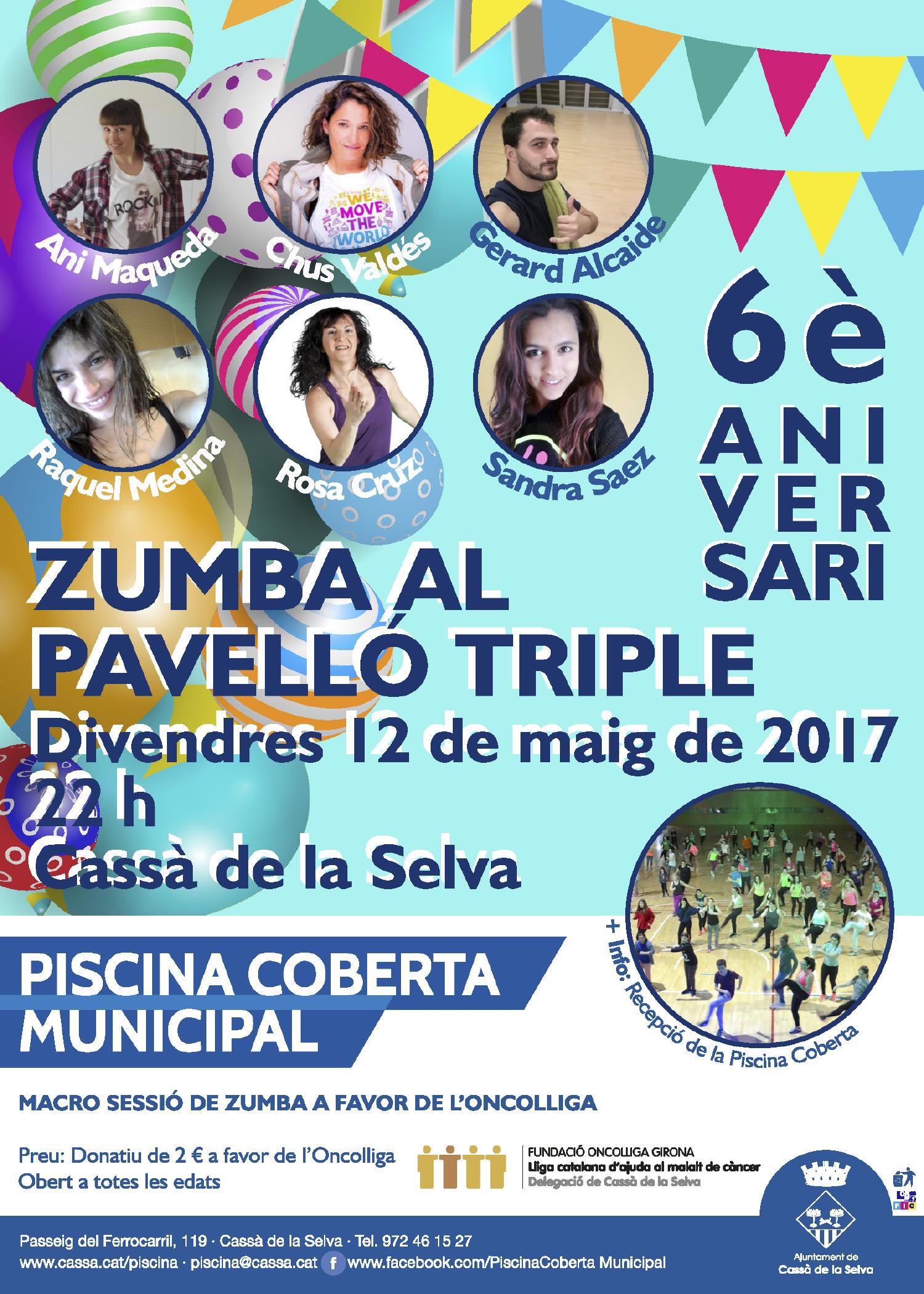 Divendres dia 12 de maig, finalitzen les activitats del 6è aniversari de la piscina amb una sessió de Zumba al Pavelló Triple de Cassà en benefici de Oncolliga girona.
