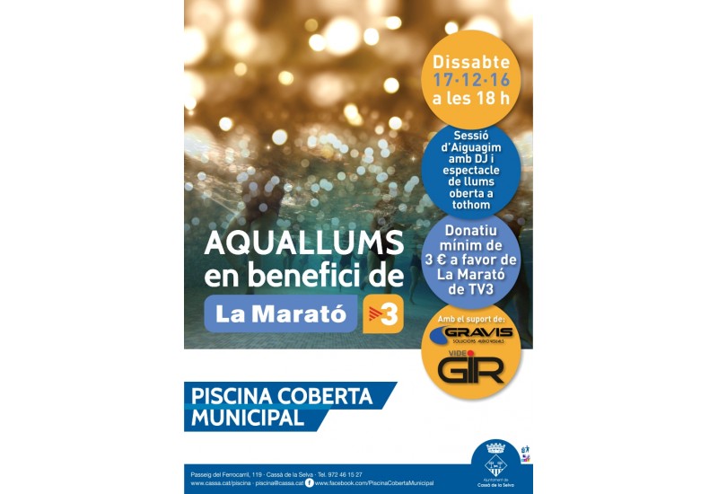 L'acte, que es farà aquest dissabte 17 de desembre a les 6 de la tarda, consisteix en una sessió d'aiguagim amb DJ i espectacle de llums, i es proposa batre el rècord de 100 persones practicant-la simultàniament. Els assistents a la sessió hauran de fer un donatiu mínim de 3€ a favor de La Marató.