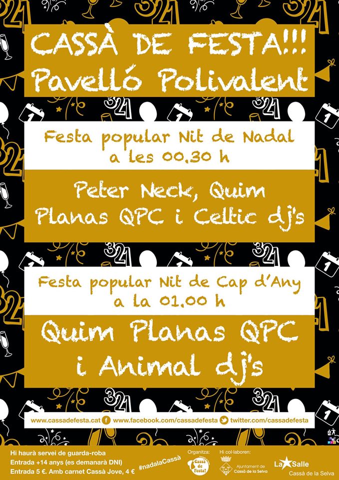 Com és tradició els darrers anys, la Comissió de Festes organitza les revetlles de la Nit de Nadal i de Cap d'Any, amb entrada per a majors de 14 anys al preu de 5€ (4€ amb el carnet Cassà Jove). Començaran a 2/4 d'1 i s'allargaran fins ben entrada la matinada. La Comissió de Festes fa una crida per a la captació de voluntaris que vulguin col·laborar amb el Carnaval i la Festa Major.