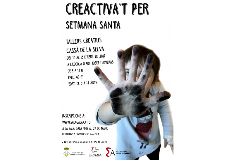 L'Escola d'Art Josep Lloveras de Cassà de la Selva organitza el "Creativa't", els tallers creatius infantils de Setmana Santa que tindran lloc del 10 al 13 d'abril de 9 a 13 h a la Sala Galà. El preu és de 40€ i les inscripcions es poden fer a través del web cassa.cat o a la mateixa Sala Galà.