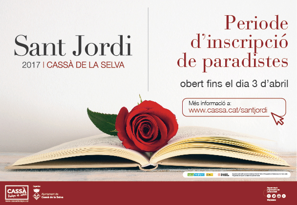 Fins al 3 d'abril estan obertes les inscripcions per disposar d'una parada a la Diada de Sant Jordi que tindrà lloc el diumenge 23 d'abril durant tot el dia la plaça de la Coma de Cassà de la Selva. Les instàncies es poden presentar a l'Ajuntament amb la documentació que es pot consultar al web cassa.cat