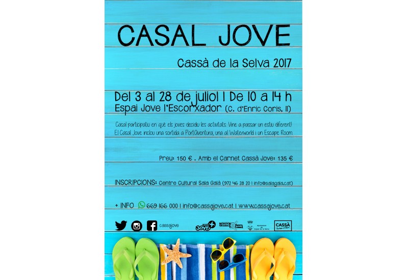 Cassà Jove organitza el Casal Jove que tindrà lloc a l'Espai Jove L'Escorxador del 3 al 28 de juliol de 10 a 14h, i que va destinat a joves d'entre 12 i 16 anys. Les inscripcions es poden fer al Centre Cultural Sala Galà i el preu és de 150€ (135€ per als titulars del Carnet Cassà Jove).