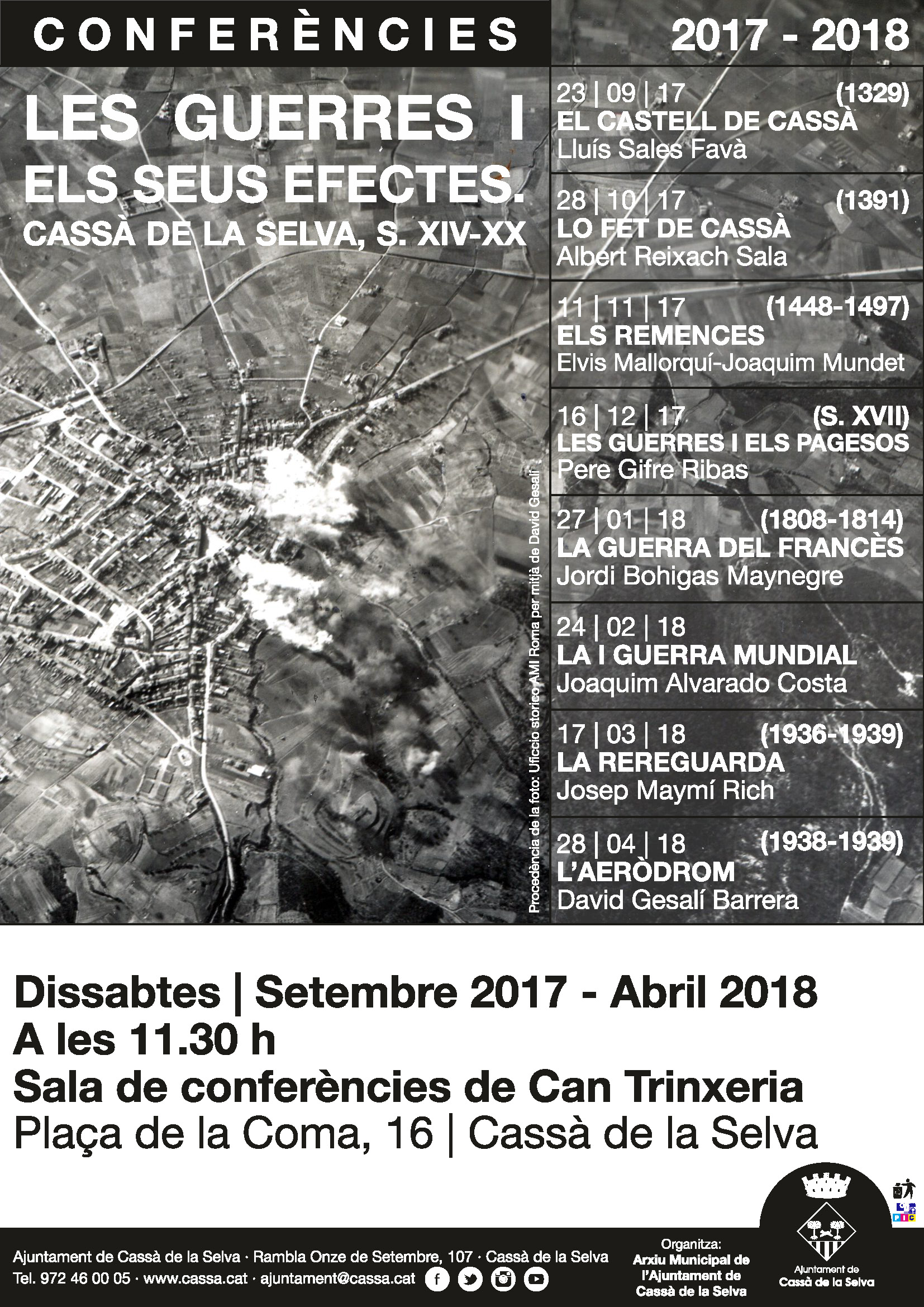 En total s'han programat vuit conferències, des d'aquest dissabte fins al mes d'abril, a través de les quals es presentaran les darreres recerques històriques sobre com han incidit uns quants conflictes bèl·lics en la societat cassanenca. La primera conferència serà la que porta per títol "Una fortalesa en temps de violència feudal. El castell de Cassà de la Selva a inicis del segle XIV", i anirà a càrrec de Lluís Sales, investigador de l'Institut de Recerca Històrica de la UdG. Tindrà lloc dissabte a 2/4 de 12 del matí a Can Trinxeria.