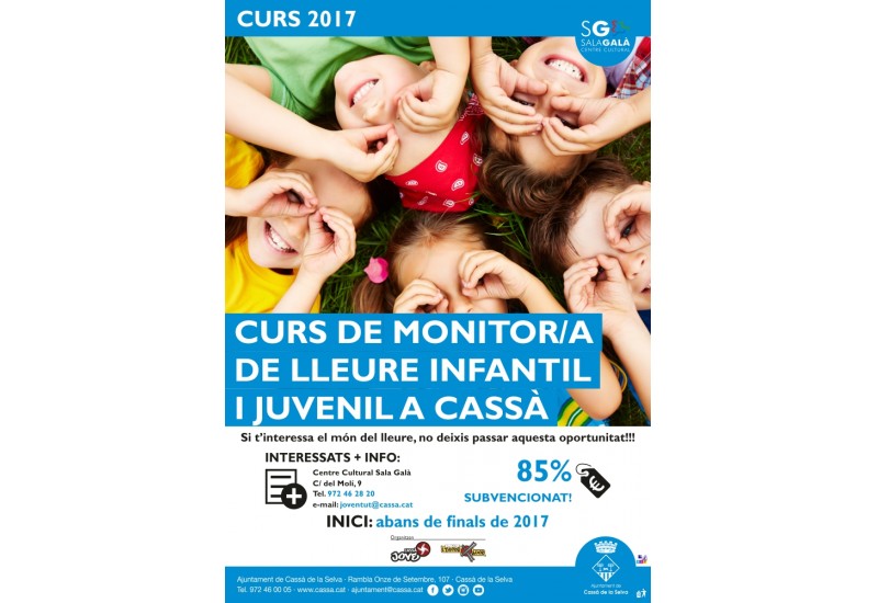Cassà Jove ofereix un curs de monitor/a de lleure infantil i juvenil subvencionat amb un 85%. El curs s'impartirà a Cassà abans de finalitzar el 2017. Per a més informació us podeu adreçar al centre cultural Sala Galà, al telèfon 972462820, o a l'adreça electrònica Aquesta adreça de correu-e està protegida dels robots de spam.Necessites Javascript habilitat per veure-la.