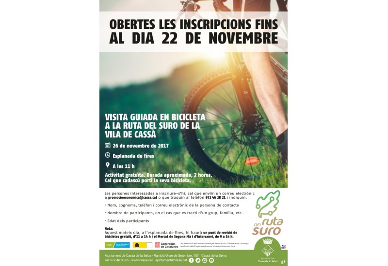 La ruta tindrà lloc el diumenge 26 de novembre i coincidirà amb el mercat de segona mà i d'intercanvi. El punt de trobada serà a les 11h a l'esplanada de fires. L'activitat, que és gratuïta, tindrà una durada aproximada de dues hores i cal que cadascú porti la seva bicicleta. Les inscripcions es poden fer al correu electrònic Aquesta adreça de correu-e està protegida dels robots de spam.Necessites Javascript habilitat per veure-la. o al telèfon 972 46 28 21 indicant nom, cognoms, telèfon i e-mail de la persona de contacte, nombre de participants i edat dels mateixos.