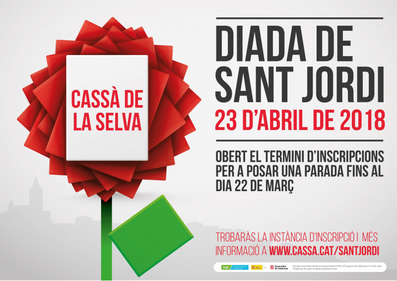 Resta obert el període d'inscripcions per als paradistes que vulguin participar a la diada de Sant Jordi d'enguany, que se celebrarà a la plaça de la Coma el mateix dilluns 23 d'abril. Els productes que es podran vendre seran tots els relacionats amb el Sant Jordi: llibres, roses, música, artesania o articles diversos d'alimentació relacionats amb la cultura catalana. Els interessats han de presentar una instància electrònica, juntament amb la documentació requerida. Trobareu tots els detalls al web cassa.cat