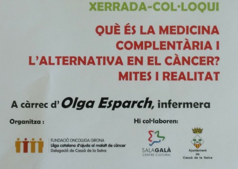 Avui dimecres a les 19:30h tindrà lloc a la Sala La Coma de Cassà de le Selva la xerrada-col·loqui "Què és la medicina complementària. L'alternativa en el càncer? Mites i realitat", a càrrec d'Olga Esparch, infermera. L'acte és organitzat per la delegació d'Oncolliga a Cassà.