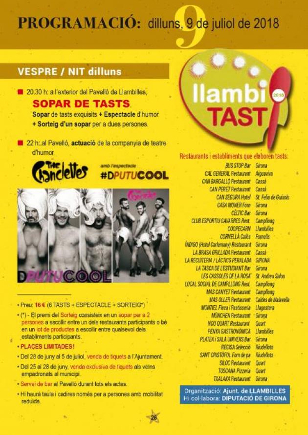 Llambilles tanca avui la Festa Major 2018 amb el Llambitast, un sopar a base de tastets oferts per més de vint establiements de la comarca dedicats a la restauració i als productes alimentaris. Començarà a 2/4 de 9 del vespre i es complementarà amb un espectacle d'humor a càrrec de la companyia de teatre The Chanclettes.
