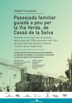 El proper dissabte 15 de setembre tindrà lloc una passejada familiar guiada per la Via Verda de Cassà amb motiu de la cloenda dels actes del 125è aniversari del Tren Petit, que connectava Sant Feliu de Guíxols i Girona entre els anys 1892 i 1969. El punt de trobada serà a les 17:30h a l'aparcament de la piscina coberta. Es visitarà la màquina de tren, s'emprendrà la passejada guiada per la Via Verda, i finalment s'oferirà un petit refrigeri al parc del carrilet. L'acte és gratuït però cal inscripció prèvia al web cassa.cat.