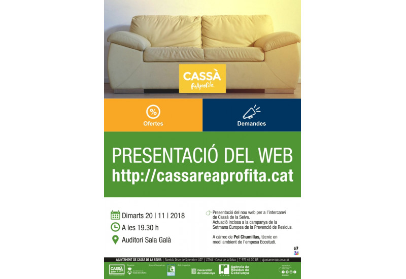 L’Ajuntament de Cassà de la Selva presenta avui al vespre el nou web cassareaprofita.cat. Es tracta d’una iniciativa municipal que té per objectiu fomentar l’intercanvi, i que està inclosa dins la campanya de la Setmana Europea de la Prevenció de Residus. Maite Garrigòs, técnica de Medi Ambient de l’Ajuntament de Cassà de la Selva, ha explicat a Ràdio Cassà que el web té dos apartats, el d’ofertes i el de demandes, i que l’unic requisit que es demana és que els intercanvis siguin gratuïts. La presentació del web cassareaprofita.cat es farà a 2/4 de 8 del vespre a la Sala Galà.