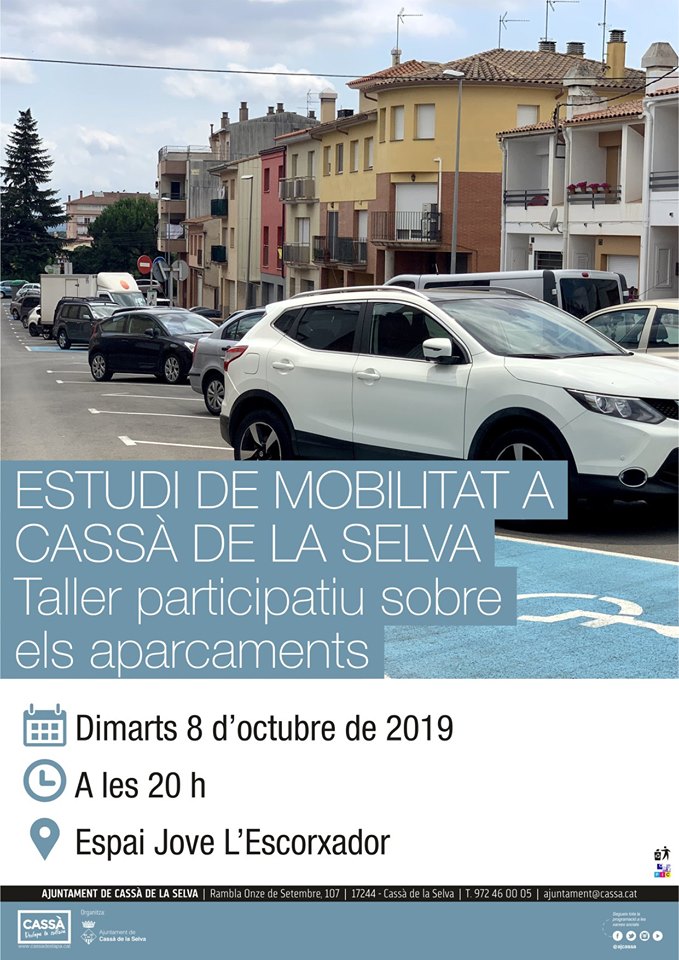 L’Ajuntament de Cassà de la Selva ha programat per avui, dimarts 8 d’octubre, un taller participatiu obert a tothom, per tractar el tema dels aparcaments al municipi. Aquest és l’últim taller emmarcat dins la fase de propostes de l’Estudi de Mobilitat a Cassà, i se celebrarà després del que es va fer fa uns dies sobre la mobilitat activa (a peu i en bicicleta) i sobre la mobilitat rodada. Els participants podran traslladar esmenes, reforçar conceptes, resoldre dubtes o expressar disconformitats. L’objectiu final és definir un Estudi de Mobilitat el més adaptat posible a les voluntats de la ciutadania i a les necessitats de Cassà de la Selva.