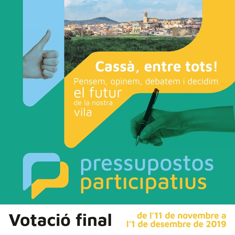 La votació final dels pressupostos participatius 2019 de Cassà de la Selva segueix vigent fins al proper 1 de desembre. Recordem que es pot votar a través del web www.cassa.cat o omplint les butlletes que s’han repartit als domicilis i dipositant-les a les urnes situades a l’Ajuntament (Can Nadal), a la Sala Galà i a la Piscina Coberta. L’Ajuntament de Cassà destinarà 60.000€ del pressupost municipal al projecte o projectes que sumats no superin aquesta quantitat. Les propostes que han passat a votació final són aquestes: