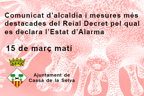 En el següent comunicat d'aquest diumenge a les 11.30 h, l'Alcalde de Cassà, Robert Mundet, exposa les mesures més destacades del Reial Decret pel qual es declara l’Estat d’Alarma i un nou document, actualitzat aquest matí de diumenge per part del CECAT, amb les preguntes i respostes més freqüents.