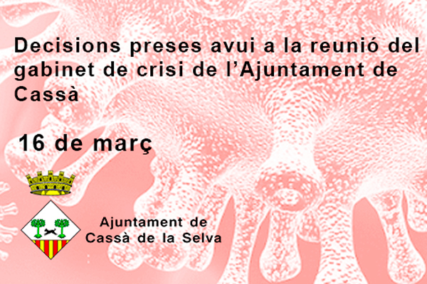 A la reunió del gabinet de crisi d'avui dilluns s'han pres algunes decisions noves i també es recorden alguns punts aprovats ahir diumenge.