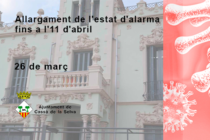 A la reunió del gabinet de crisi de l’Ajuntament de Cassà, el principal punt del dia ha estat l’allargament de l’estat d’alarma fins a l’11 d’abril decretat per l’Estat Espanyol i les conseqüències que això comporta per al municipi.