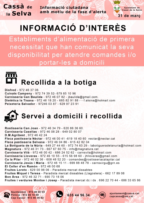 Llistat dels establiments comercials de Cassà que han comunicat la seva disponibilitat per atendre comandes i/o portar-les a domicili: