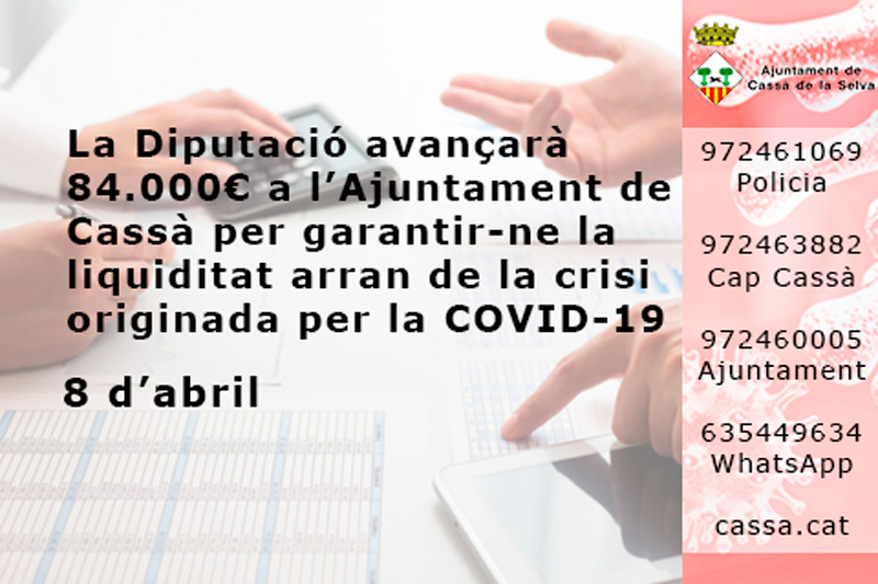 Atenent a aquest escenari, la Diputació de Girona injectarà 10.934.532 euros als ajuntaments i consells comarcals, import que correspon a un avançament de la meitat del Fons de Cooperació Econòmica previst per a aquest any, amb l’objectiu de garantir-ne la liquiditat financera i dotar-los de recursos perquè puguin contribuir a la recuperació econòmica que es derivi de la situació actual. La Diputació avançarà a l’Ajuntament de Cassà de la Selva 84.873,78 €