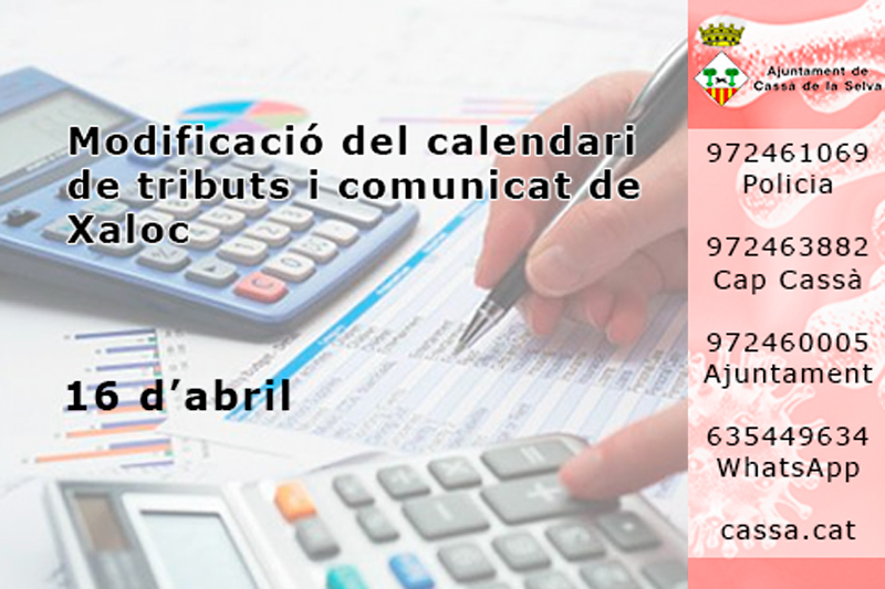 L’Ajuntament de Cassà de la Selva, a través de Xaloc –organisme que gestiona la recaptació municipal-, suspèn els terminis de pagament en voluntària de tributs i taxes fins que finalitzi l’estat d’alarma. També queden suspesos els terminis de recaptació en executiva i els interessos que es puguin generar. Al web www.cassa.cat es pot consultar el calendari amb les dates de pagament actualitzades. Aquesta mesura no s’aplicarà als contribuents que tinguin els pagaments fraccionats. Recordar també que no es cobraran els serveis municipals que no s’han pogut oferir durant el període d’estat d’alarma, i que es retornarà la part proporcional dels serveis no oferts durant una part del mes de març. Aquests serveis inclouen la Llar d’infants, la Sala Galà, la Piscina coberta i el servei de dia de la residència geriátrica Sant Josep. El mateix criteri s’aplicarà a la taxa d’ocupació de la via pública per taules i cadires.