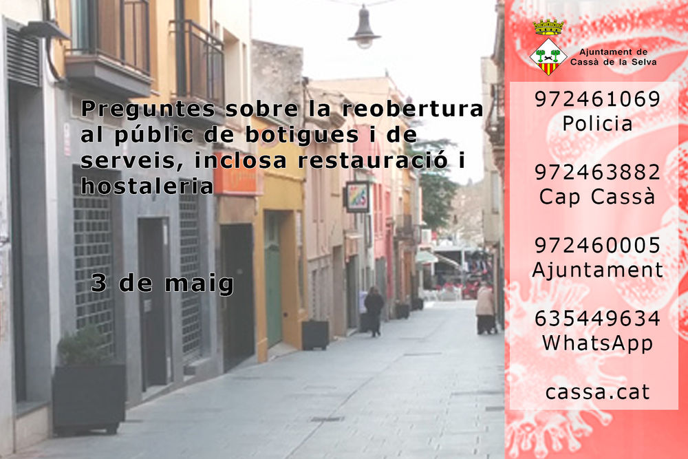 Després de la publicació al BOE, s’ha autoritzat la reobertura al públic dels locals i establiments de comerç minorista (botigues) i de serveis professionals (reparacions, perruqueries i centres d’estètica, etcètera), inclosa la restauració i l’hostaleria, amb determinades condicions de seguretat.