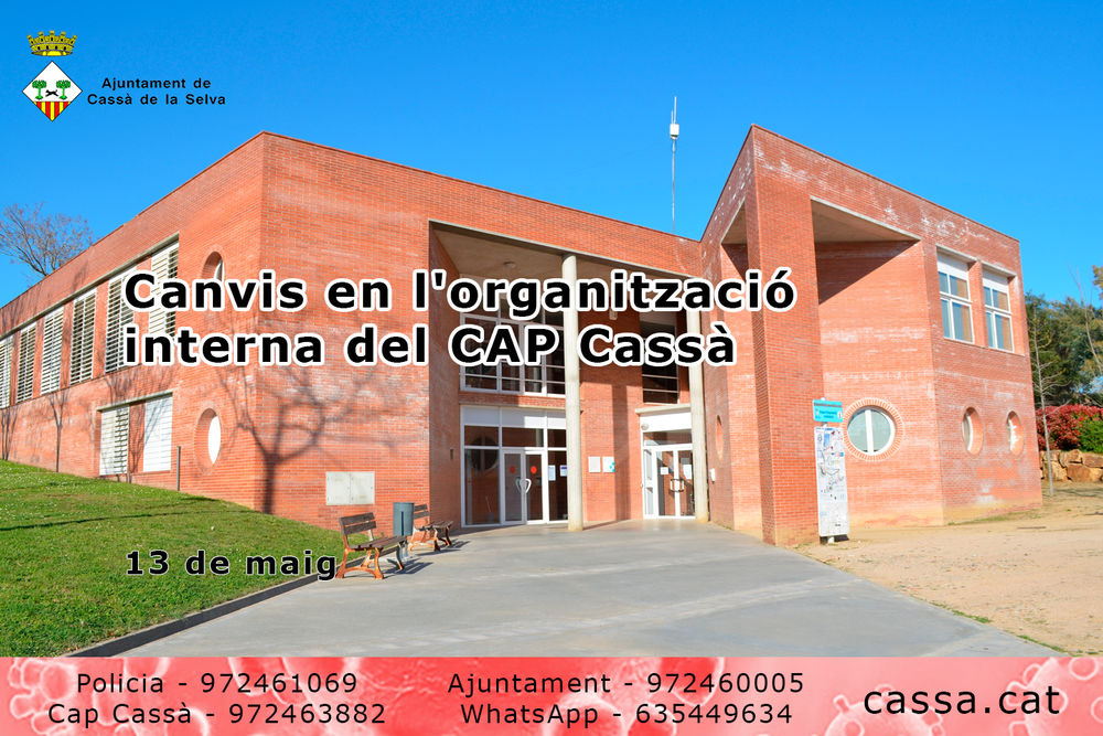 El CAP Cassà ha fet uns canvis a la seva organització per tal que la majoria de metges i infermeres (llevat dels que estan de baixa o apartats del servei d'atenció al públic per malalties de risc en el context del coronavirus) puguin fer atenció als centres de salut oberts.