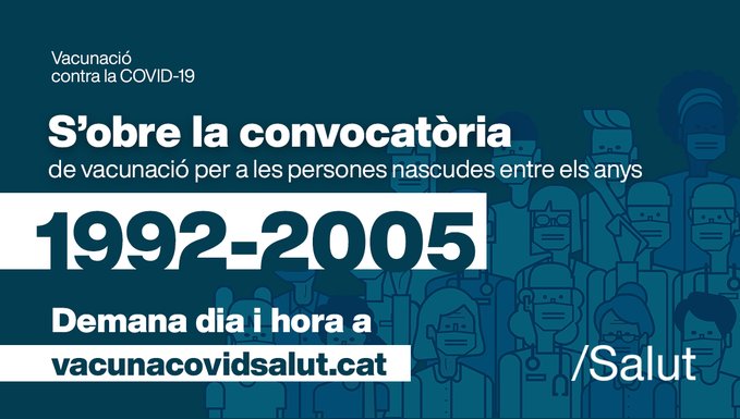 Totes les persones nascudes entre el 1992 i el 2005 poden començar des d'avui a demanar cita per vacunar-se a vacunacovidsalut.cat