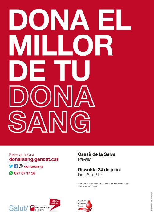 El dissabte 24 de juliol tindrà lloc a Cassà de la Selva una nova campanya de donació de sang. Es farà al pavelló polivalent de 16 a 21h. Des de l’organització es demana als donants que reservin hora a donarsang.gencat.cat o al Whatsapp 677 07 17 56.