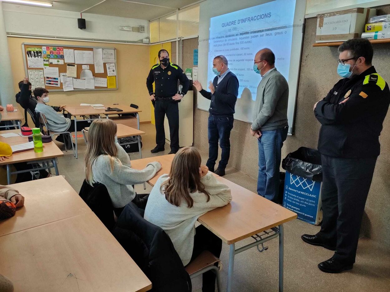 L'alcalde, Robert Mundet, acompanyat del regidor de Governació, Marià Montsunyer i el cap de la Policia Local de Cassà, Josep Lluís Lara, han visitat una de les classes que tenia lloc a l'Institut de Cassà, on els alumnes de segon d'ESO han pogut comentar els seus dubtes.