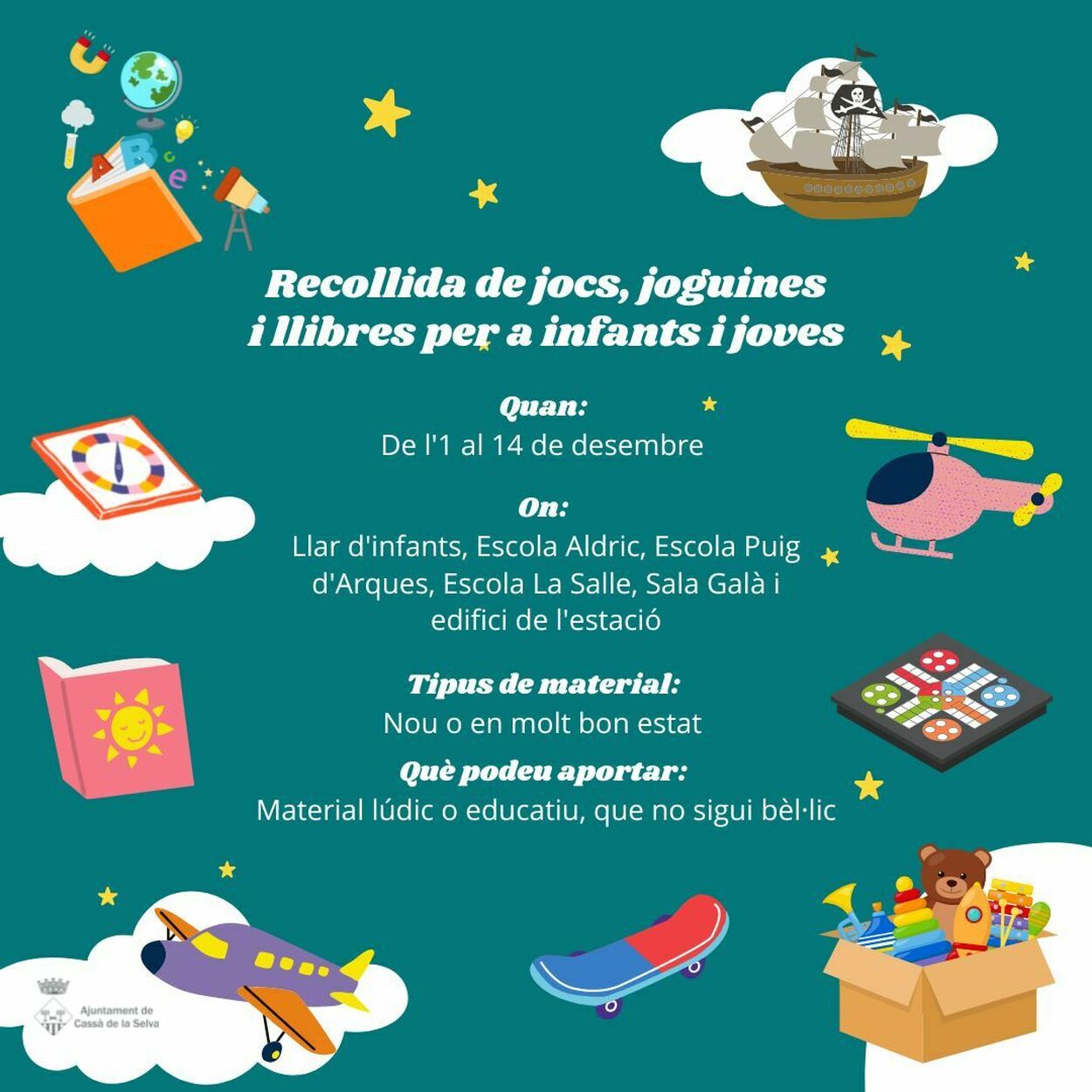 Us convidem a participar a la campanya de recollida de joguines, jocs i llibres que tindrà lloc a Cassà que comença avui fins al 14 de desembre. Amb aquesta iniciativa volem garantir que les joguines arribin a les famílies en situació vulnerable de Cassà, i a la vegada que es pugui donar una nova vida a aquells jocs, joguines o llibres que estan aparcats esperant altres infants i joves que els puguin gaudir de nou.