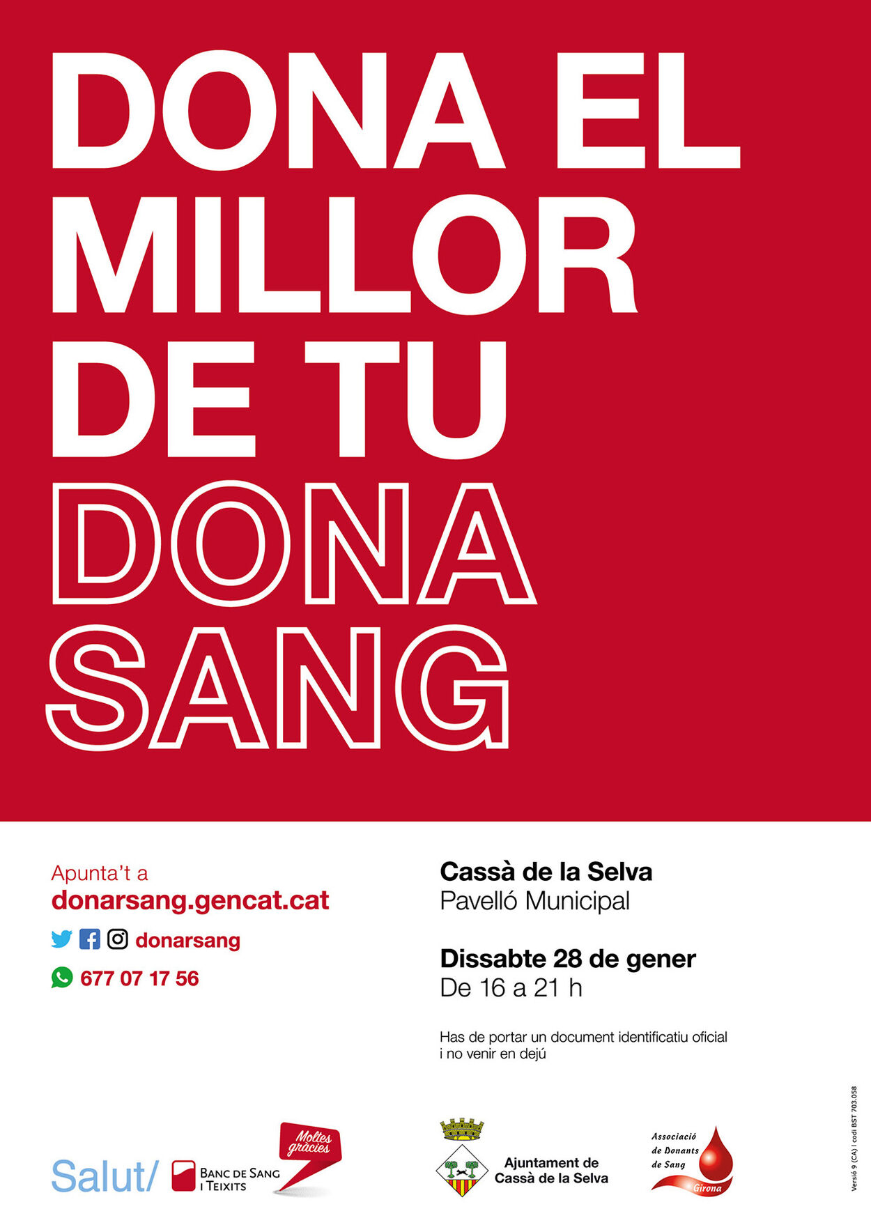 Es pot donar sang a Cassà el dissabte 28 de gener de 16 a 21 h al pavelló municipal i en els 12 grans hospitals on el Banc de Sang té un espai de donació o bé en diverses col·lectes que s’organitzen cada dia per tot Catalunya.