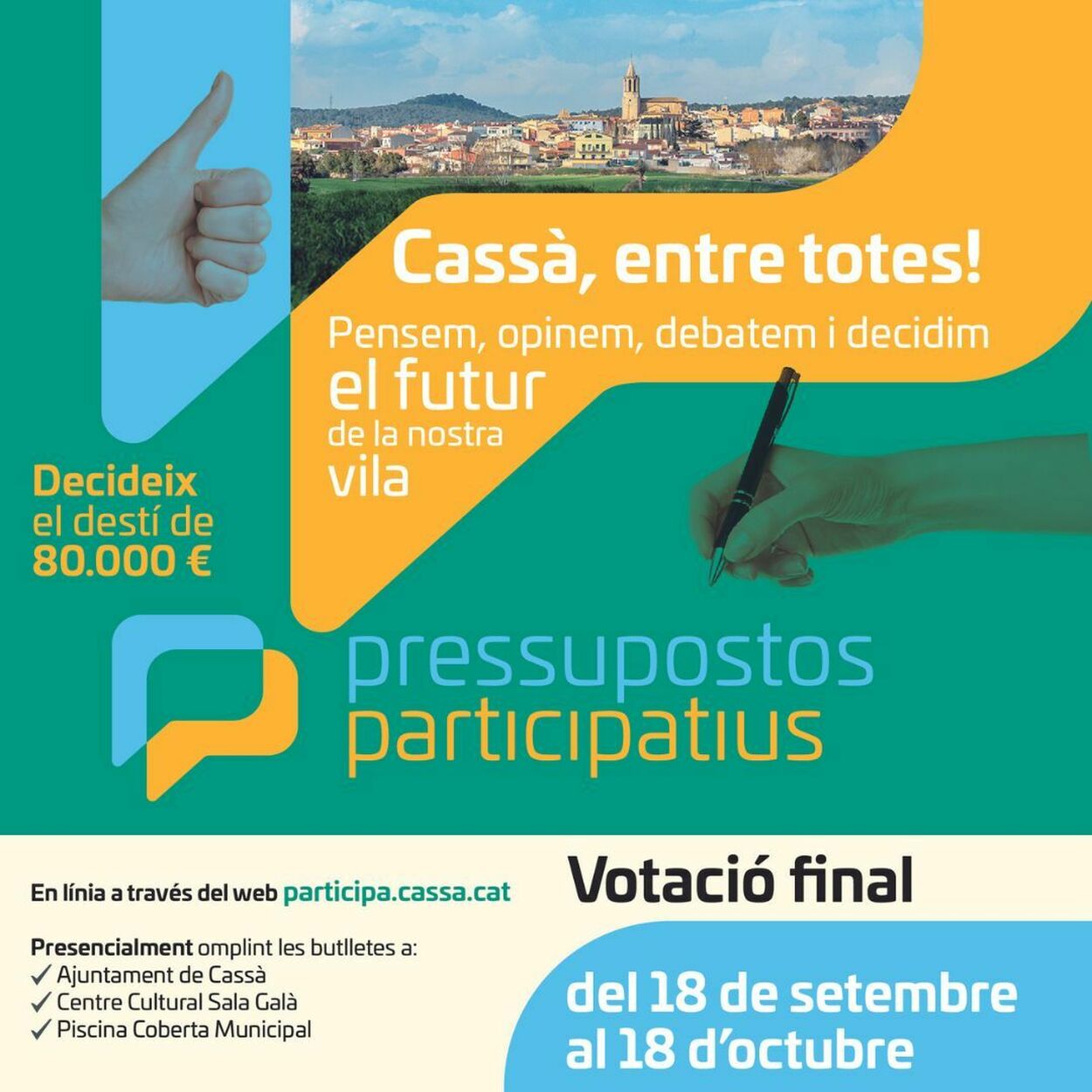 Es poden votar un màxim de tres propostes i el pressupost total per fer efectius els projectes és de 80.000 €. La votació està oberta a totes les persones empadronades a Cassà que tinguin 16 anys o més, teniu temps de votar fins al 18 d'octubre. Entreu a participa.cassa.cat per participar, també podeu votar de forma presencial a l'ajuntament, a Sala Galà i a la piscina.