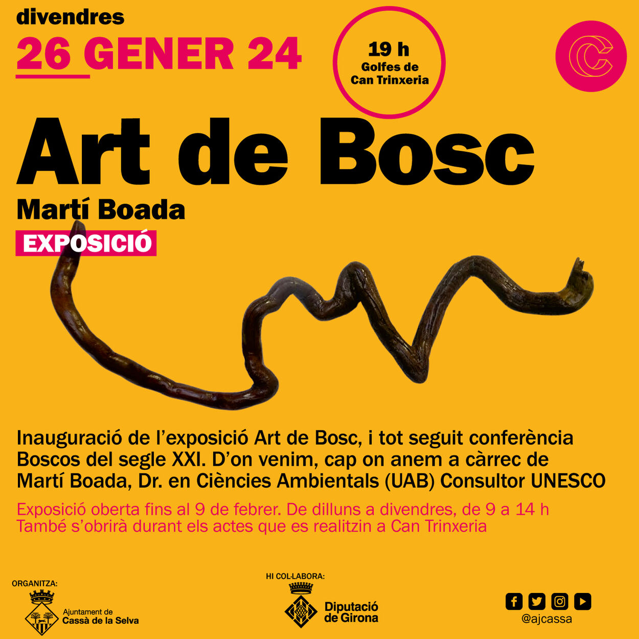 Aquest divendres, 26 de gener a les 19 h, a Can Trinxeria de Cassà de la Selva inaugurem l'exposició Art de Bosc que vindrà acompanyada d'una conferència a càrrec del seu autor, Martí Boada.
