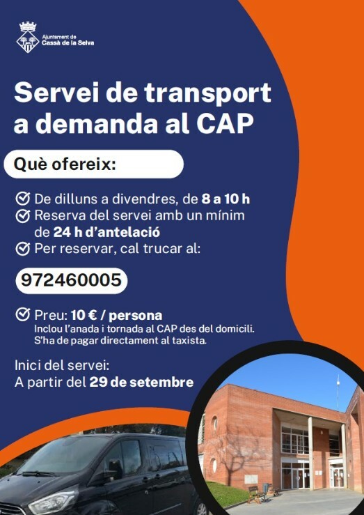 L’Ajuntament de Cassà de la Selva posa en marxa, a partir del dilluns 29 de setembre, un nou servei de transport a demanda en taxi fins al Centre d’Atenció Primària (CAP). Aquesta iniciativa està adreçada a les persones majors de seixanta anys que necessitin desplaçar-se al CAP, especialment en la franja de 8 a 10 del matí, coincidint amb l’horari habitual de les analítiques i proves de Sintrom.