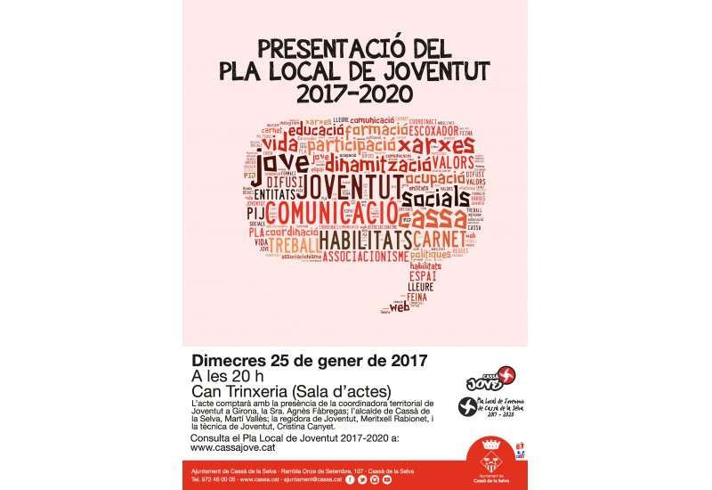 Les línies estratègiques del nou Pla Local de Joventut pretenen potenciar les habilitats per la vida, l'ocupació, la formació i la comunicació entre els joves de Cassà. L'acte de presentació tindrà lloc a can Trinxeria a les 8 del vespre.