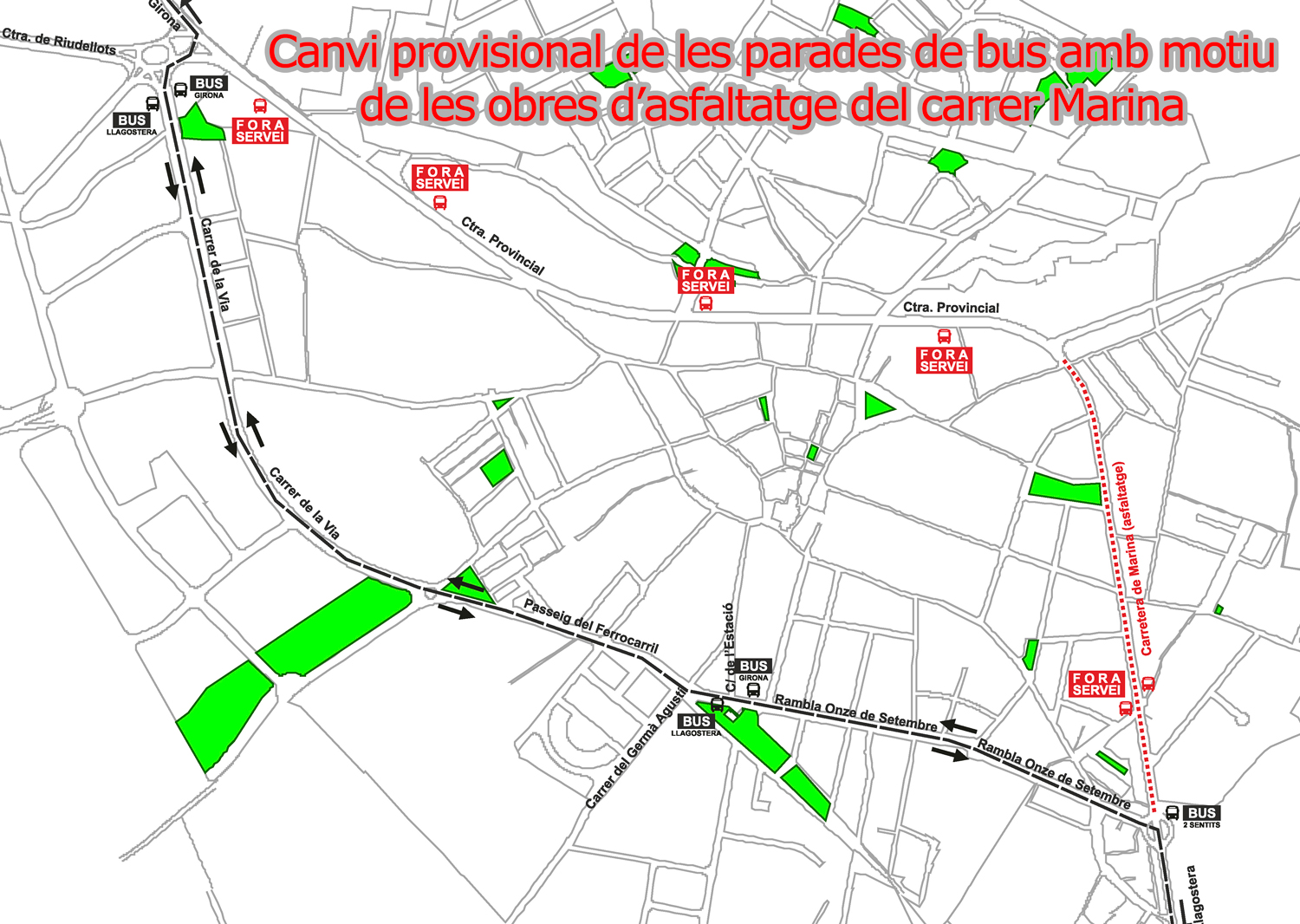 Avui han començat les obres al carrer Marina, consistents en l'asfaltatge de la via i en la remodelació dels passos elevats. Els treballs comporten la reubicació de les parades de bus, tant del carrer Marina com de la carretera Provincial, que s'han situat a la Rambla 11 de setembre, a davant de l'Ajuntament, i al carrer de la Via.