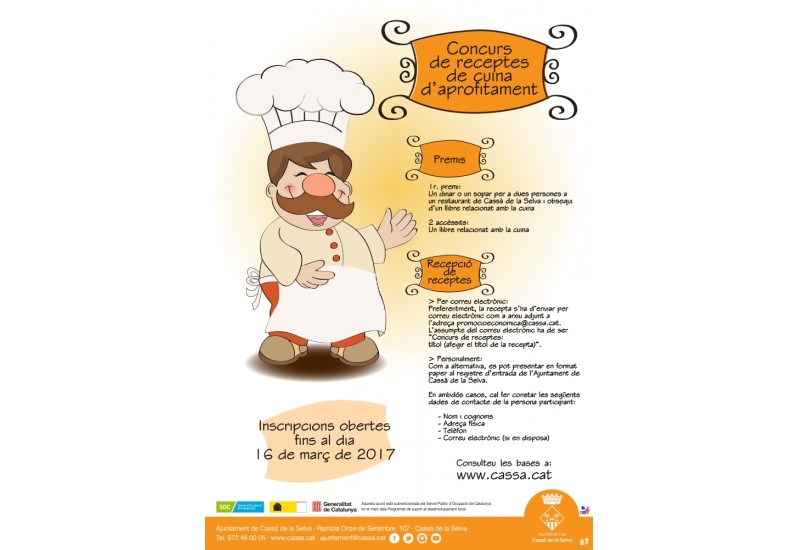 Amb motiu del Mercat de Segona mà i d'Intercanvi, que tindrà lloc el 26 de març, s'ha organitzat un concurs de receptes de cuina d'aprofitament. Els participants poden enviar les receptes fins al 16 de març de 2017 al correu electrònic Aquesta adreça de correu-e està protegida dels robots de spam.Necessites Javascript habilitat per veure-la. o presencialment en format de paper al registre d'entrada de L'Ajuntament de Cassà de la Selva.