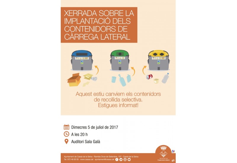 Avui dimecres a les 8 del vespre tindrà lloc a la Sala Galà una xerrada sobre els contenidors de càrrega lateral, que ja han estat licitats pel Consell Comarcal del Gironès i que l'Ajuntament de Cassà de la Selva instal·larà aquest mes de juliol a diversos punts del municipi.