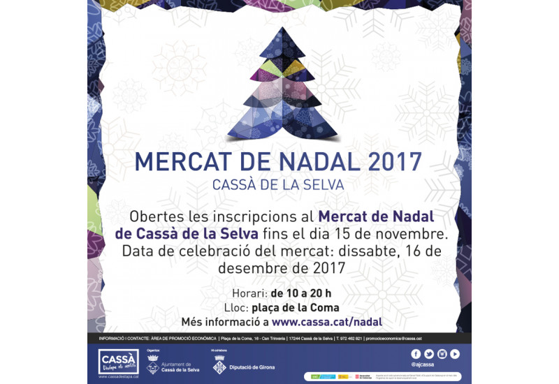 Fins al 15 de novembre es pot sol·licitar un espai per disposar d'una parada al Mercat de Nadal que tindrà lloc a la plaça de la Coma de Cassà de la Selva el dissabte 16 de desembre de 10 a 20h. La tramitació electrònica de la sol·licitut es pot fer al web cassa.cat.