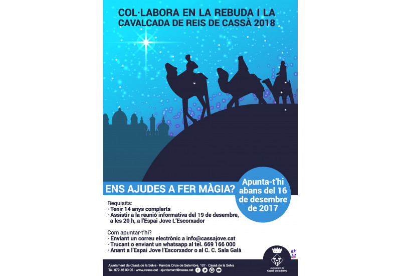 Ses Majestats d'Orient ja estan preparant el seu viatge anual fins a Cassà de la Selva. Per això demanen la col·laboració a tots els veïns del poble perquè la seva arribada sigui ben lluïda. Els requisits per participar-hi són: tenir més de 14 anys, i assistir a la reunió informativa que tindrà lloc el 19 de desembre a les 20h a l'Espai Jove l'Escorxador. Les inscripcions es poden fer al correu electrònic Aquesta adreça de correu-e està protegida dels robots de spam.Necessites Javascript habilitat per veure-la., a la Sala Galà o a l'Escorxador. El termini resta obert fins al 16 de desembre.