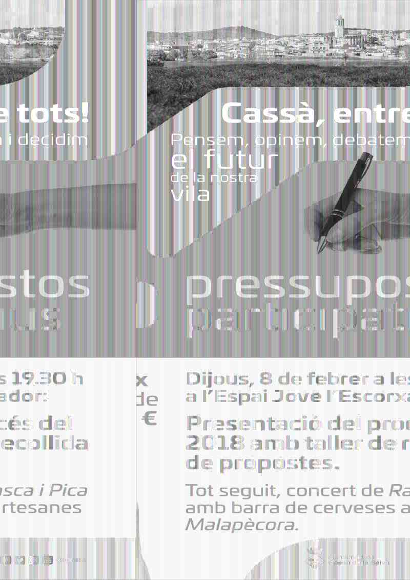 L'acte es farà avui a les 19:30 a l'Espai Jove l'Escorxador amb un taller de recollida de propostes. Seguidament es farà un concert amb el grup cassanenc Rasca i Pica acompanyat d'una barra de cerveses artesanes locals. Els cassanencs poden decidir el destí d'una partida municipal de 60.000 euros.