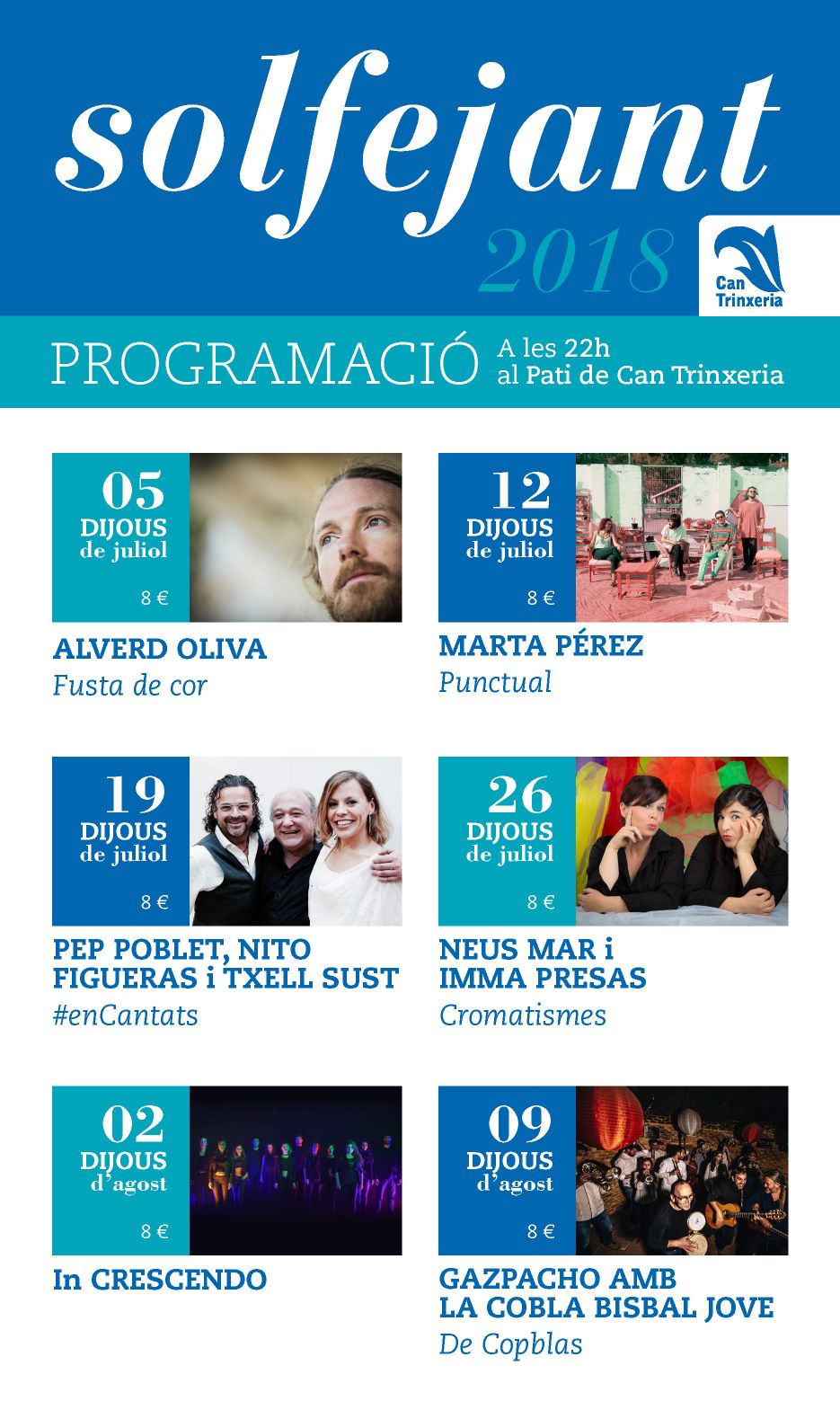 La quinzena edició del Solfejant de Cassà de la Selva comença avui amb l'actuació del músic figuerenc afincat a Cassà de la Selva, Alverd Oliva, que presentarà el seu primer disc en solitari "Fusta de cor". Els sis concerts del Solfejant tindran lloc al pati de Can Trinxeria a les 22h. Les entrades es poden adquirir a Ticketea o a la Sala Galà al preu de 8€.