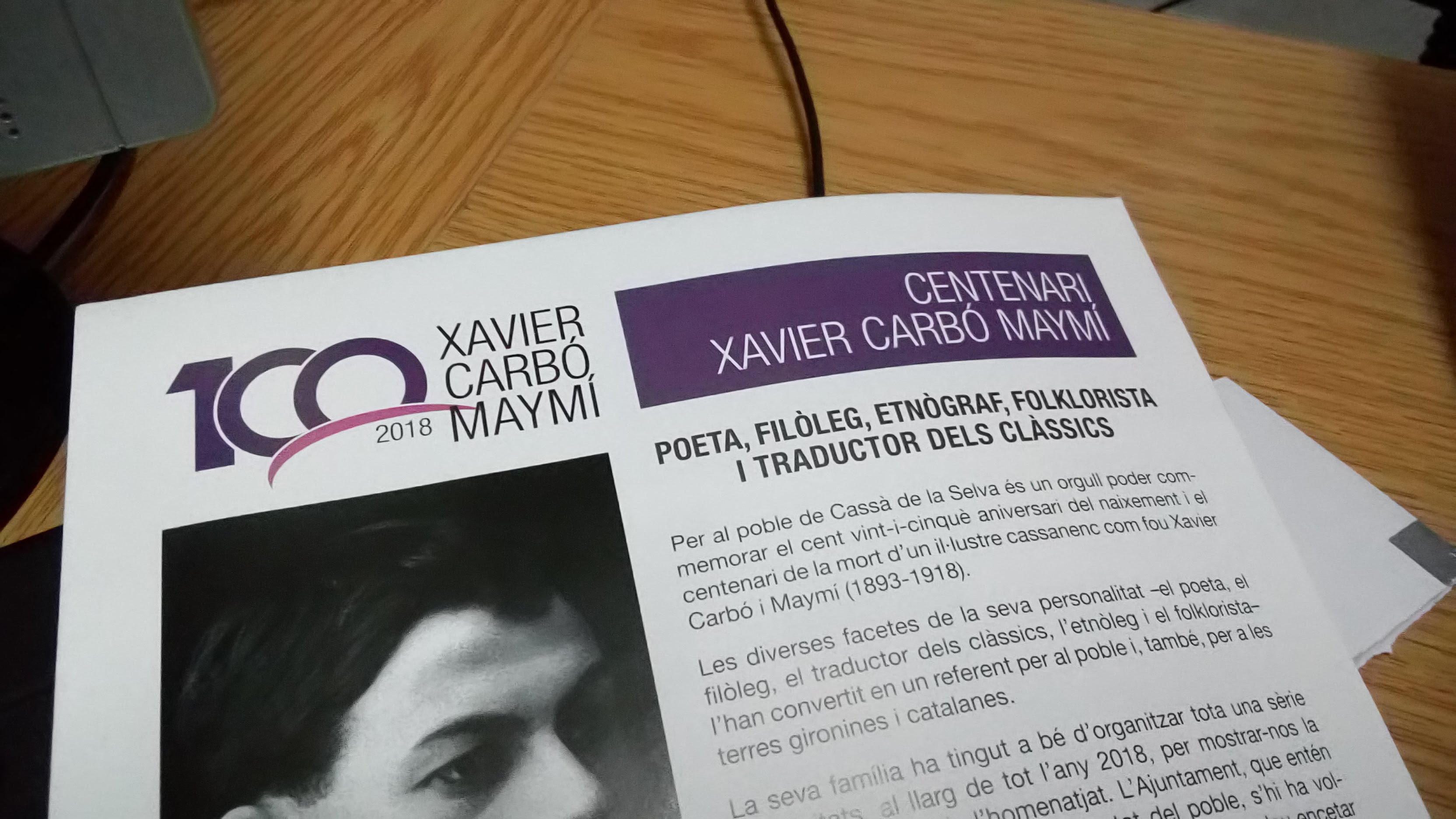 Cassà de la Selva celebrarà aquest dissabte 22 de setembre l’acte central de l’Any Carbó. A la Sala Centre Recreatiu es retrà homenatge al poeta cassanenc Xavier Carbó, en motiu del centenari de la seva mort. Es tracte d’una festa literària i musical que comptarà amb parlaments -entre els quals un de Joaquim Nadal-, les actuacions de les corals cassanenques Bell Ressó i Esclop i el Quartet Matadejonc, i la participación d’agrupacions teatrals de Cassà.