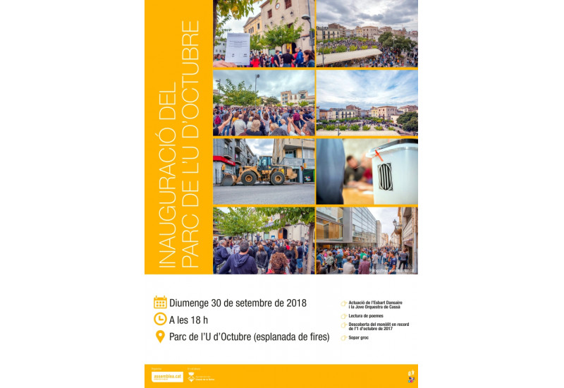 El diumenge, 30 de setembre, l'ANC Cassà, en col•laboració amb l'Ajuntament, organitza un acte per commemorar l'1 d'octubre de 2017 amb la inauguració del denominat parc de l'U d'Octubre ubicat a l'esplanada de fires, davant de l'escola Aldric (carrer Xavier Carbó). L'acte començarà a les 18 h al parc de l'U d'Octubre. Hi haurà l'actuació de l'Esbart Dansaire i la Jove Orquestra, lectura de poemes, parlaments, descoberta del monòlit en record a l'1 d'octubre de 2017 i un sopar groc.