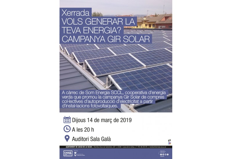 Aquest dijous 14 de març, a les 8 del vespre, la cooperativa Som Energia explicarà a Cassà de la Selva com generar la teva pròpia electricitat i parlarà de la campanya Gir Solar. El Gir Solar és una proposta per a 100 projectes “claus en mà” d’autoproducció fotovoltaica. Segueix l’exemple d’experiències que s’han realitzat en altres indrets que demostren que la manera més efectiva per impulsar instal•lacions solars domèstiques és sumar molts clients de cop, per tal d’abaratir preus i facilitar la feina d’instal•lació.