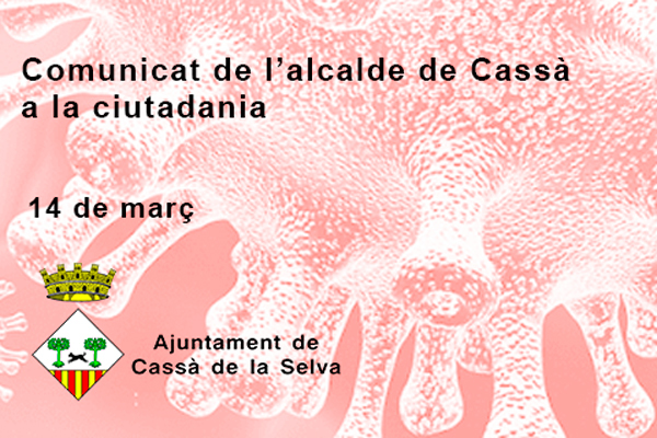 En aquest comunixat, l'alcalde de Cassà, Robert Mundet, que fa una crida a la població per mantenir la tranquil•litat i la serenor davant d'aquest cas d’emergència sanitària.