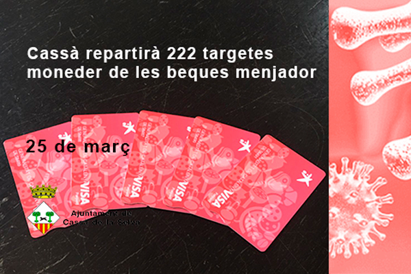 A Cassà de la Selva, demà dijous es repartiran 222 targetes moneder per a tots els nens i nenes que tenen les ajudes del menjador escolar.