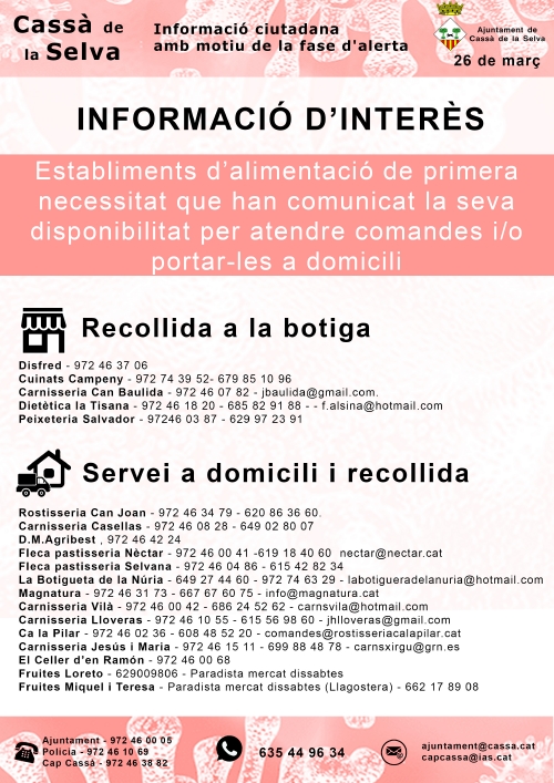 Llistat dels establiments comercials de Cassà que han comunicat la seva disponibilitat per atendre comandes i/o portar-les a domicili: