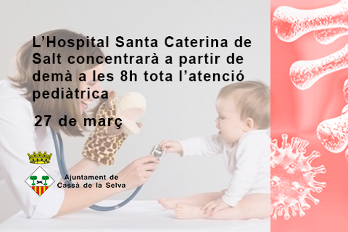 A partir d’aquest dissabte 28 de març, l’Hospital Universitari de Girona Dr. Josep Trueta deixarà de prestar activitat de pediatria i aquesta es concentrarà a l’Hospital Santa Caterina de Salt, que es farà càrrec de tota l’atenció dels infants de l’àrea del Gironès, Pla de l’Estany i Selva Interior, tant pel que fa a les urgències com l’hospitalització, així com dels pacients derivats pels hospitals comarcals de la Regió Sanitària Girona.