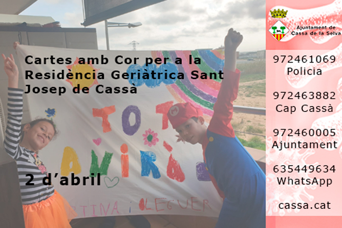 Arran de la iniciativa de “Cartes amb Cor”, que fa uns dies una professora va impulsar per tal d’enviar ànims a les persones ingressades als hospitals i als metges i infermeres que els estan cuidant, des de l’Ajuntament de Cassà de la Selva fem una crida perquè l’alumnat del municipi enviï cartes, dibuixos, vídeos, etc., a la Residència Geriàtrica Sant Josep.