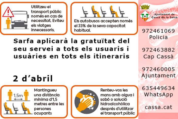 Per tant com a conseqüència de la pandèmia del COVID-19 i a la vista del contingut aprovat pel Departament de Territori i Sostenibilitat l’empresa SARFAS.L. aplicarà amb efectes a partir de dijous dia 2d’Abril, la gratuïtat del nostre servei a tots els usuaris i usuàries en tots els itineraris.